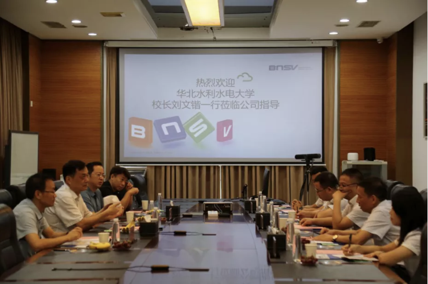 華北水利水電大學(xué)校長(zhǎng)劉文鍇、辦公室主任尹彥禮、科技處處長(zhǎng)上官林建、校友會(huì)劉悅,博納斯威董事長(zhǎng)王東輝、總經(jīng)理王榮輝、副總經(jīng)理王天彪、總工程師廖志芳等出席了揭牌儀式及座談交流。