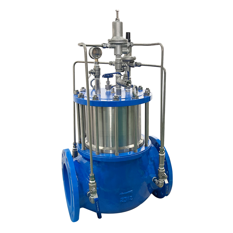 突然的停泵一般會產生巨大的壓力波動。在管道較長的供水系統當中,這種壓力波動往往表現出明顯的低壓段,繼而高壓段激聚出現。低壓導閥可感應到這種最初的壓力波降并自身開啟,以使主閥隨之開啟,從而預防從系統返回的高壓力波動。開啟的主閥會將隨之而來的高壓力波排放至大氣。高壓導閥會感應到同樣的高壓力波也會開啟并使主閥保持開啟狀態,將過余能量排放掉。當系統壓力恢復到高壓導閥的設定值時,導閥本身將會關閉,導致主閥關閉,至使系統中的壓力穩定在高壓與低壓預定值之間。